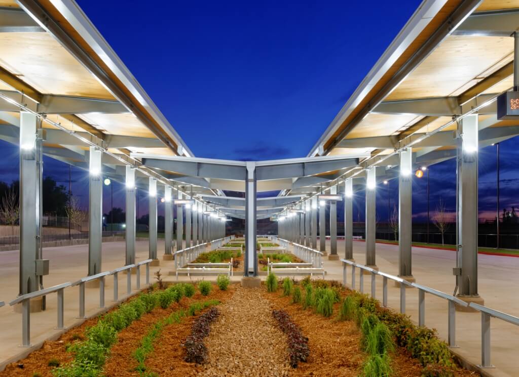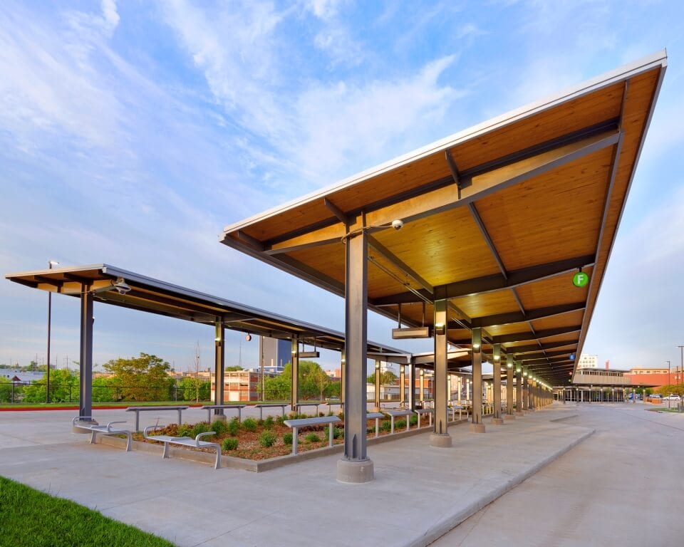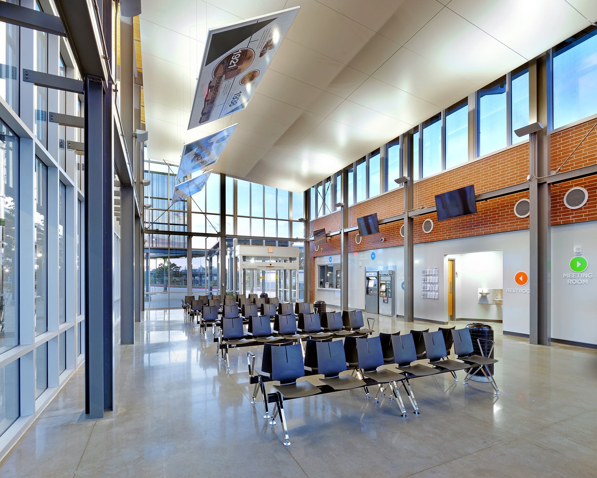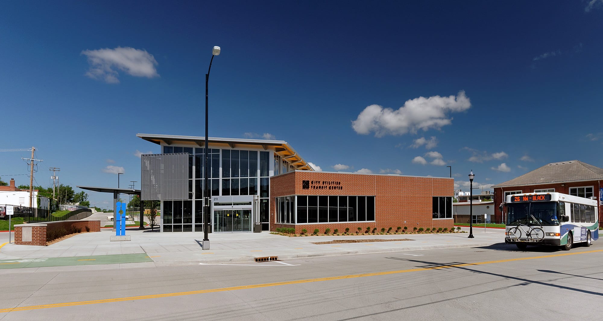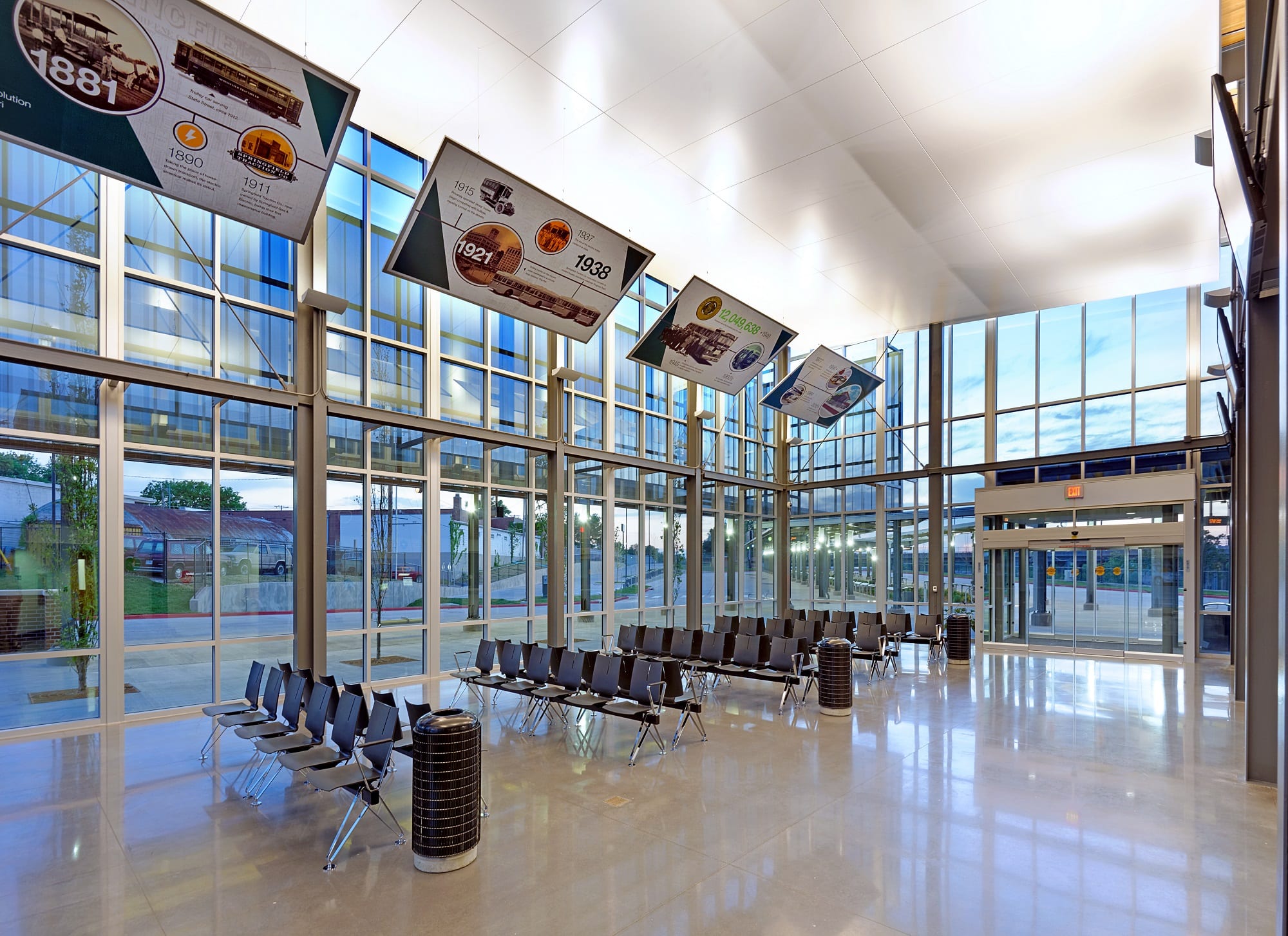 Accompanied with an innovative exterior design, the City Utilities Bus Transfer Station provides a safe and efficient environment featuring accessibility for universal needs and disabilities. The building features ticketing kiosks, City Utility payment kiosk, large monitors for displaying route, weather and news updates, Wi-Fi accessibility, bike repair station, bike lockers, driver’s lounge, charging stations, indoor and outdoor seating, and multiple platform bays equipped with technology for displaying route information. The building also includes a local community room that is available to the public.