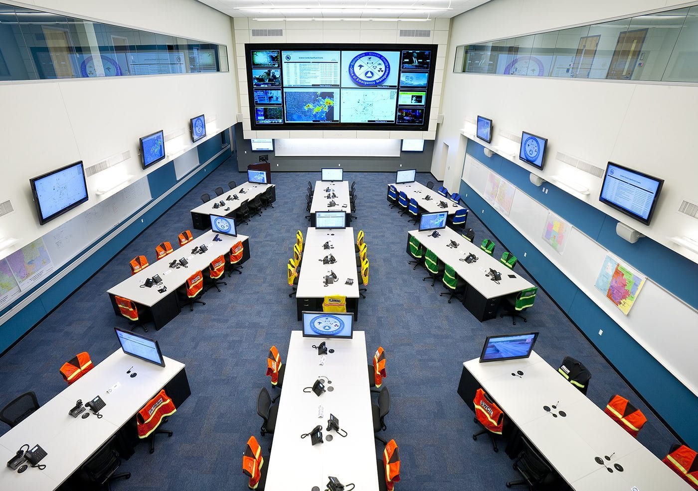 • The visual display in the Emergency Operations Center is 16′ by 34′ and capable of displaying 16 individual information feeds