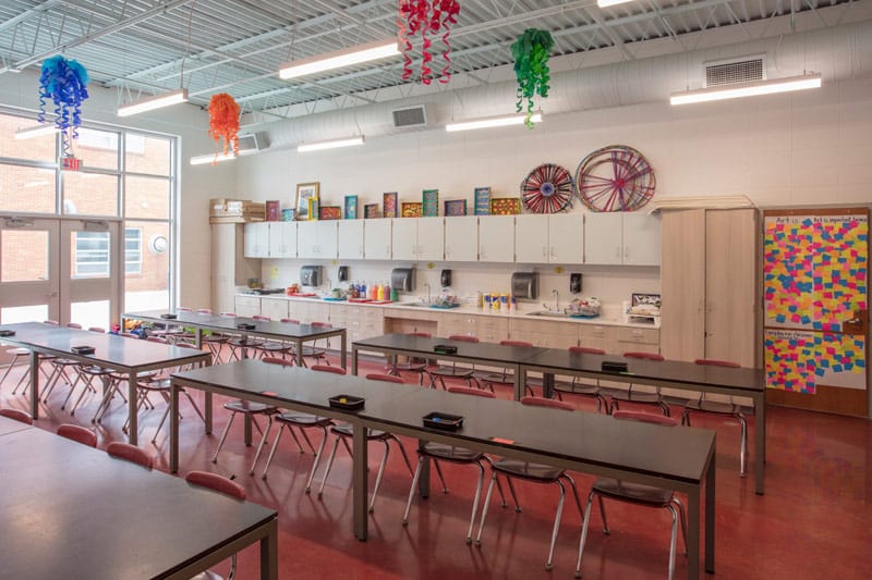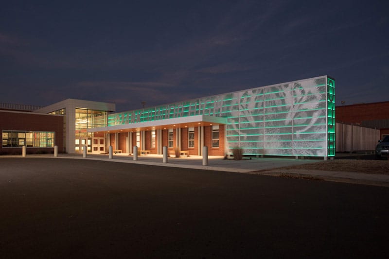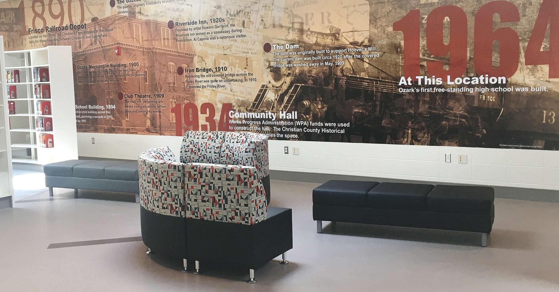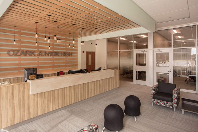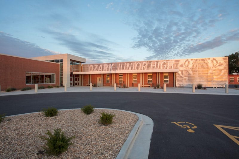 The Ozark Junior High School Addition consisted of 35,000 square feet of new construction and 24,000 square feet of renovation work. The new addition ties the west building with the remaining school making it a totally contained facility. The school includes a new state-of-the-art kitchen and cafeteria as well as new music and band rooms which also serve as storm shelter for the students and staff. The new entryway leads students into a new media room which contains student oriented features to enhance the learning ability. There is a new administration area housed in the new addition with a safe egress feature. The exterior of the building includes new parking area, bus lanes and new landscaping and sod.